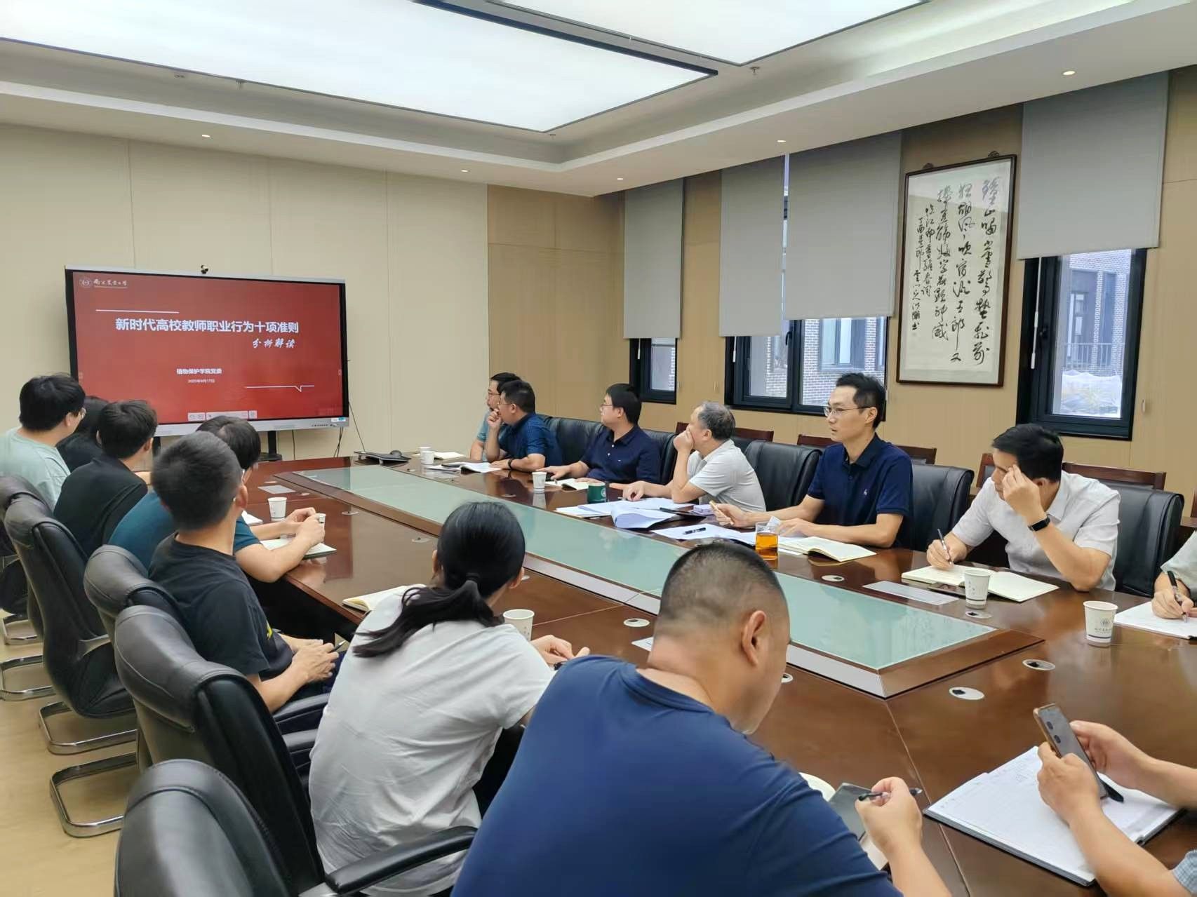 陈志亮传达了学校深入贯彻中央八项规定精神学习教育总结会议暨2025年第三次党务工作例会精神,同时对当前正在开展的“师德师风宣传月”活动进行动员部署。他结合教育部公开曝光的违反教师职业行为十项准则典型案例、校内师德失范警示案例以及《南京农业大学教师师德师风负面清单》,对《新时代高校教师职业行为十项准则》进行了深度解读,强调底线红线意识,引导大家深刻理解并自觉践行职业行为规范要求。