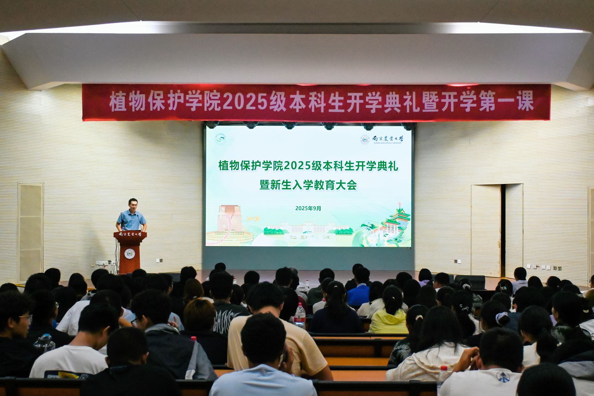9月25日,植物保护学院2025级本科生开学典礼暨开学第一课在卫岗校区大学生活动中心报告厅顺利举行。学院党委书记张正光,党委学生工作部副部长、新生班主任黄绍华,副院长刘鹏程,新生班主任代表赵晶,本科生辅导员汪越、夏健鑫、王梵钰出席会议,全体2025级新生参会。本次会议由植物保护学院党委副书记陈志亮主持。