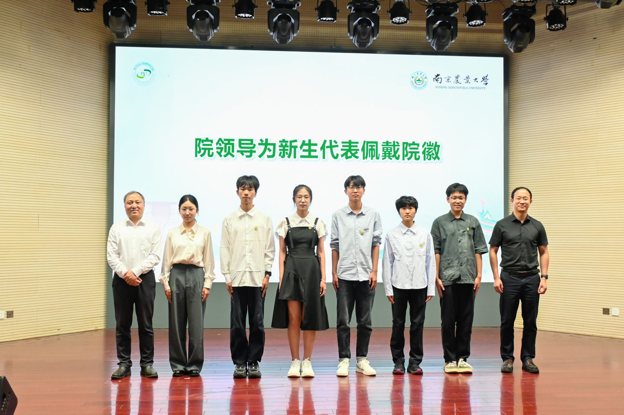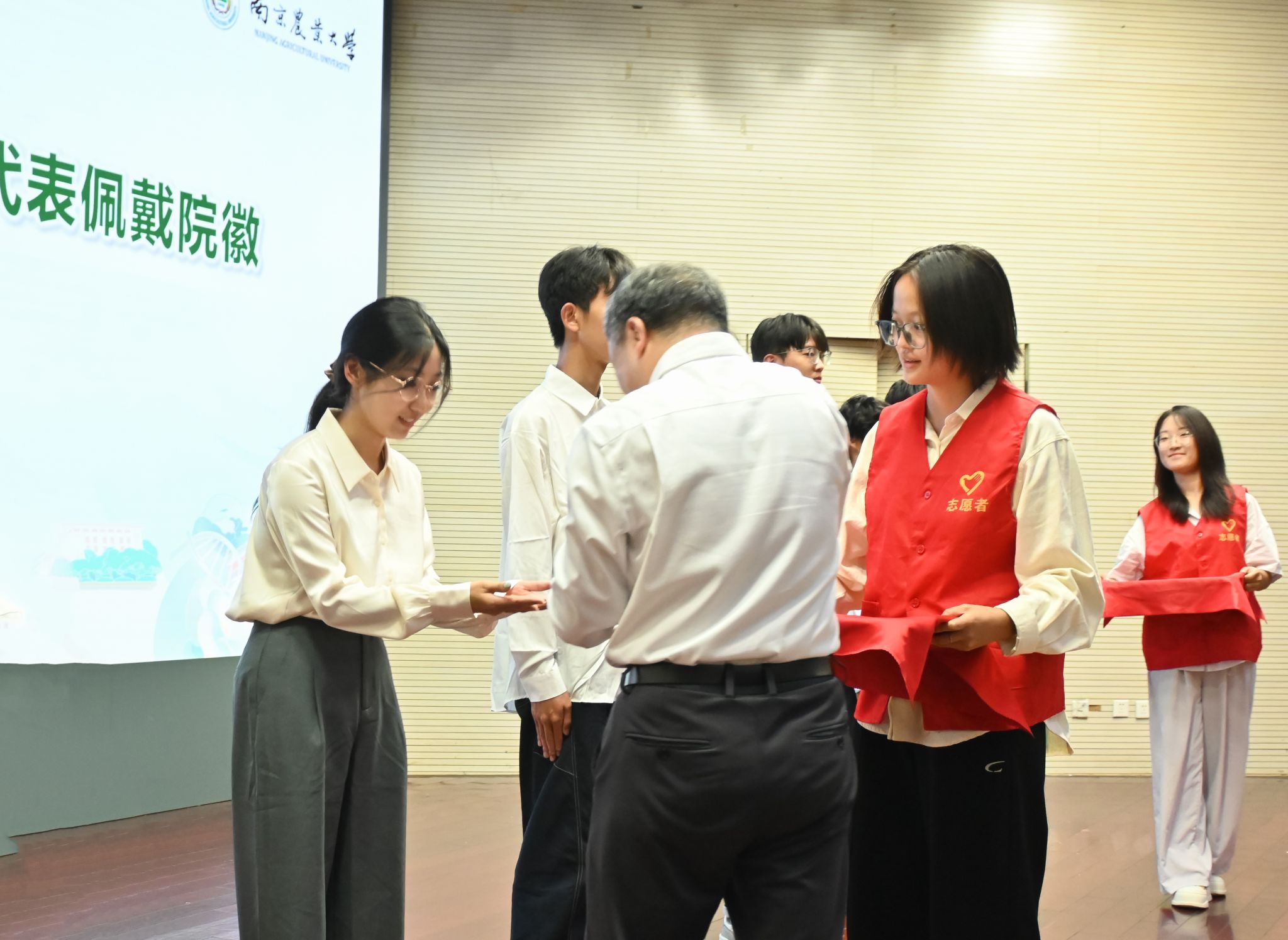 期间,还进行了新生佩戴院徽仪式,由党委书记张正光与副院长刘鹏程向6名新生代表佩戴院徽,鼓励他们秉持植保光荣传统,接过历史的“接力棒”。