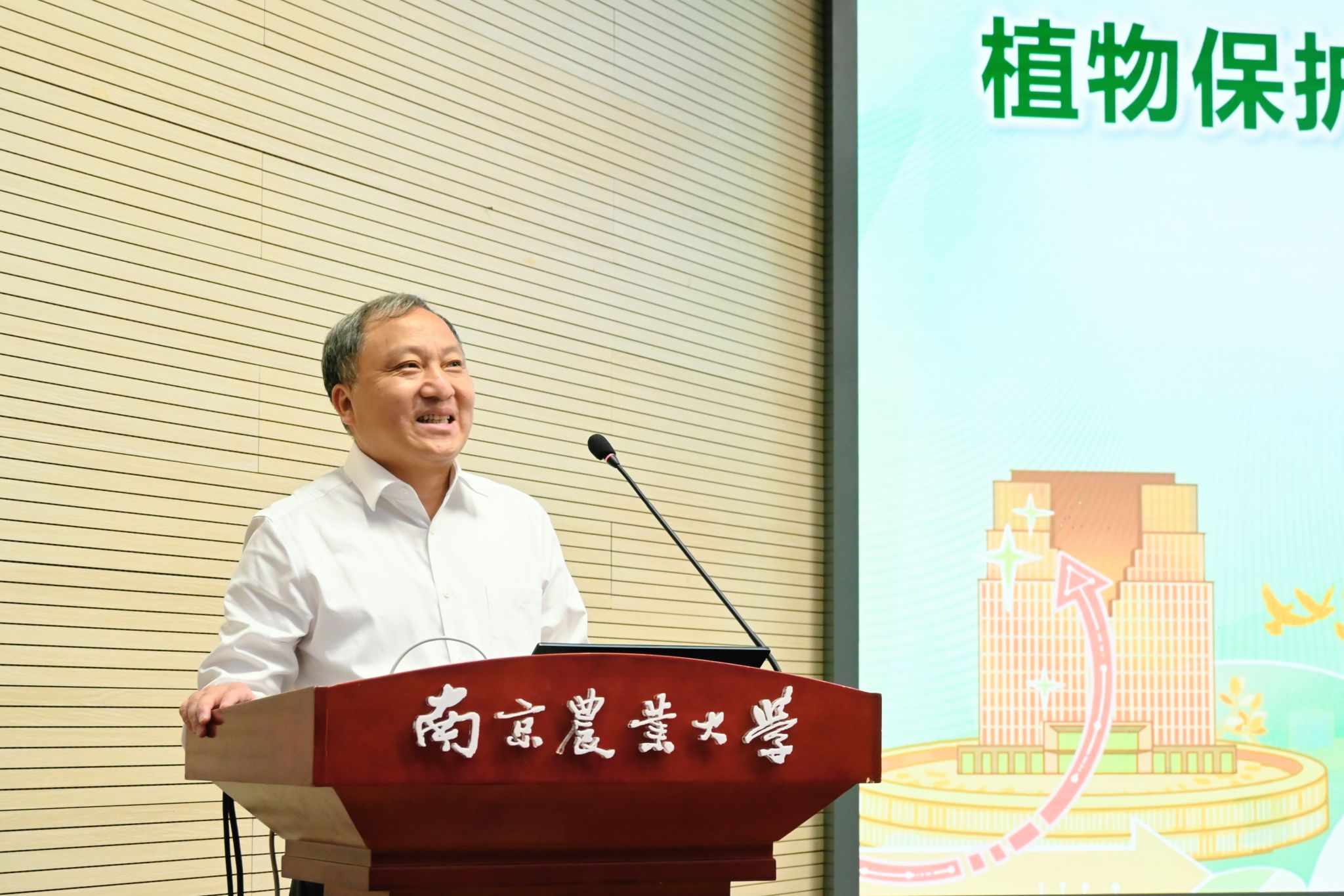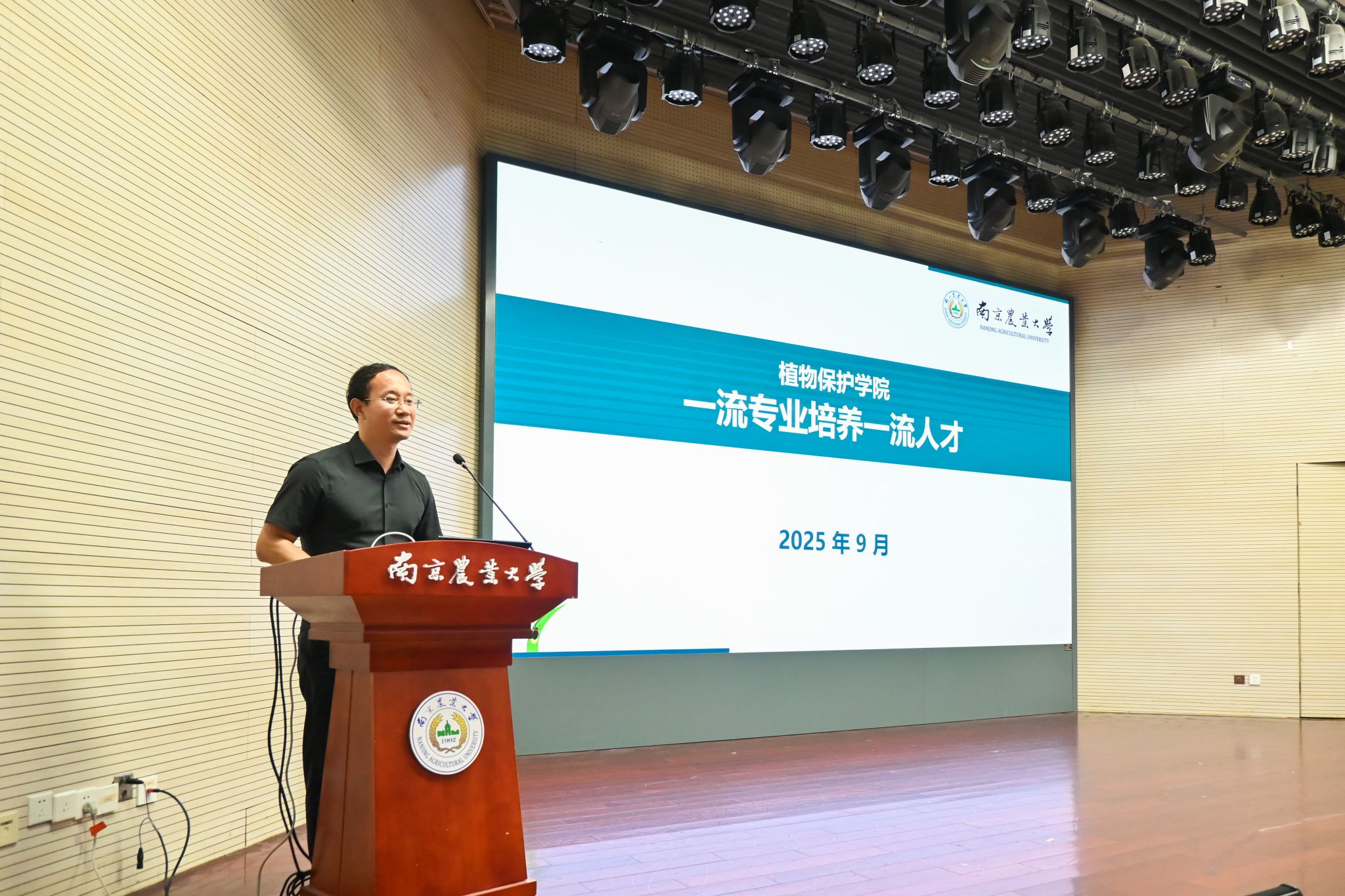 党委书记张正光作《植梦于心 保农于行》主题报告。他从“责任重大—你的专业关乎人类饭碗”、“底蕴深厚—你的专业遥遥领先”等几个方面,向新生介绍了南农植保专业的重要地位和领先水平。最后,他表达了对新生最殷切的祝愿:“愿你们在南农的四年里,成为有家国情怀、有科学家精神、有全球视野的拔尖创新型植保人才!”
